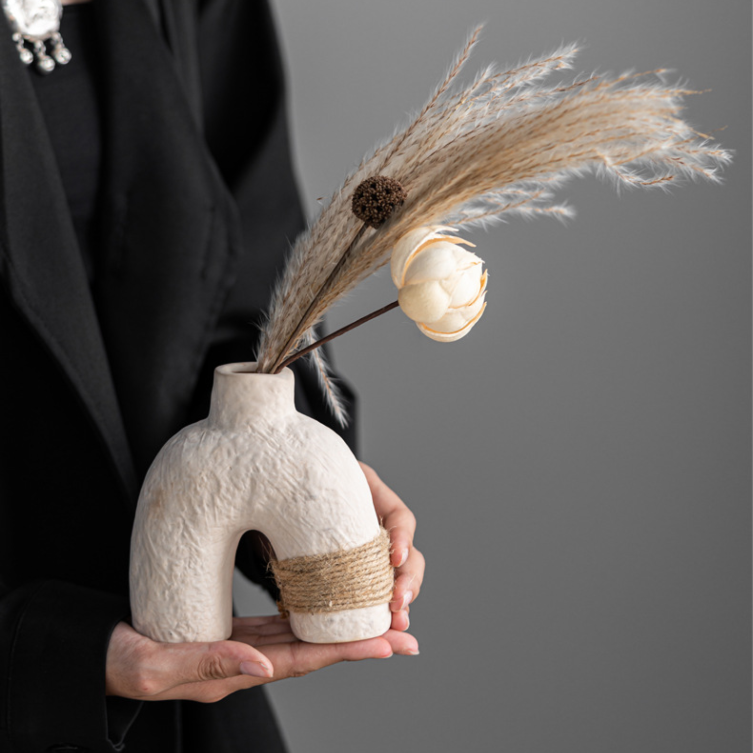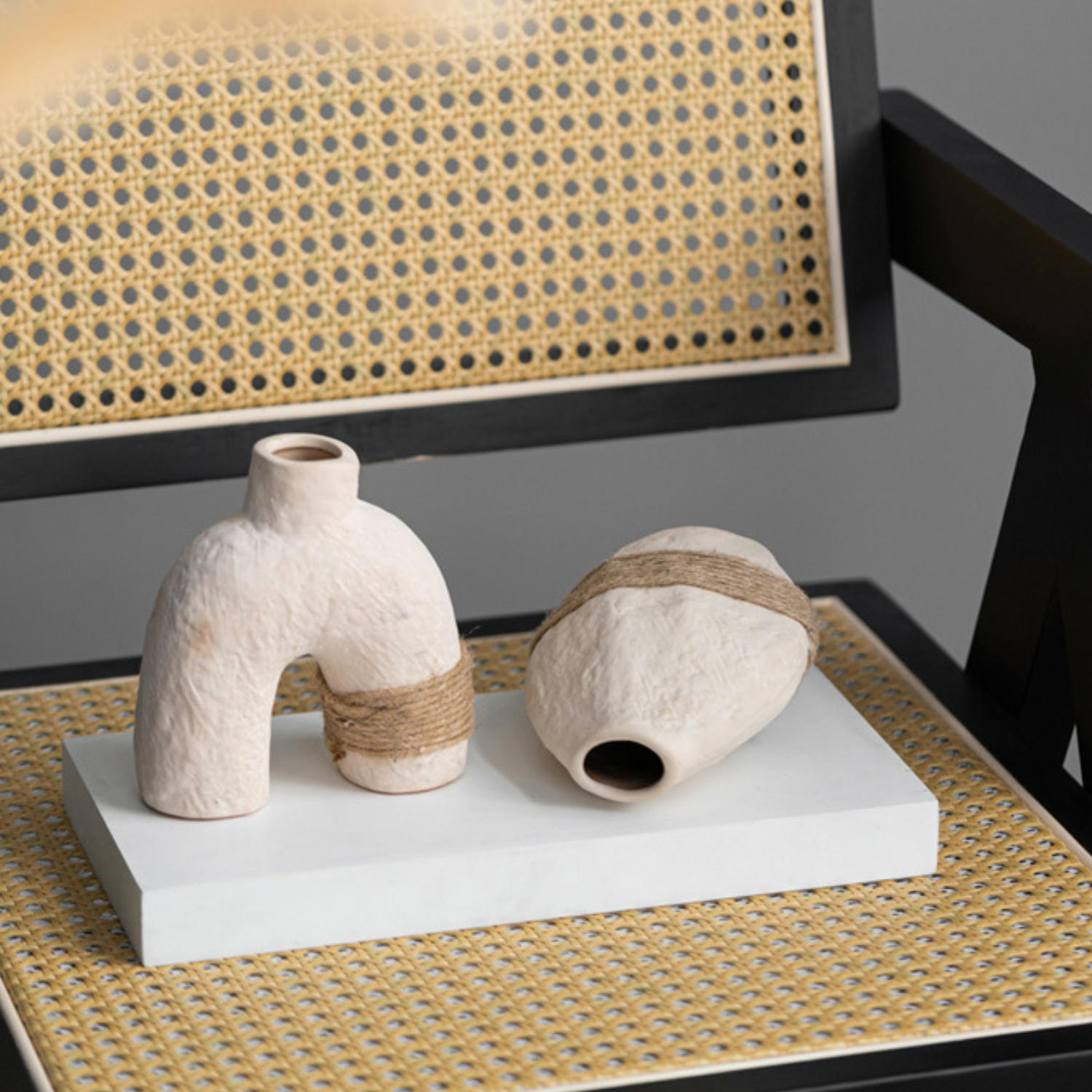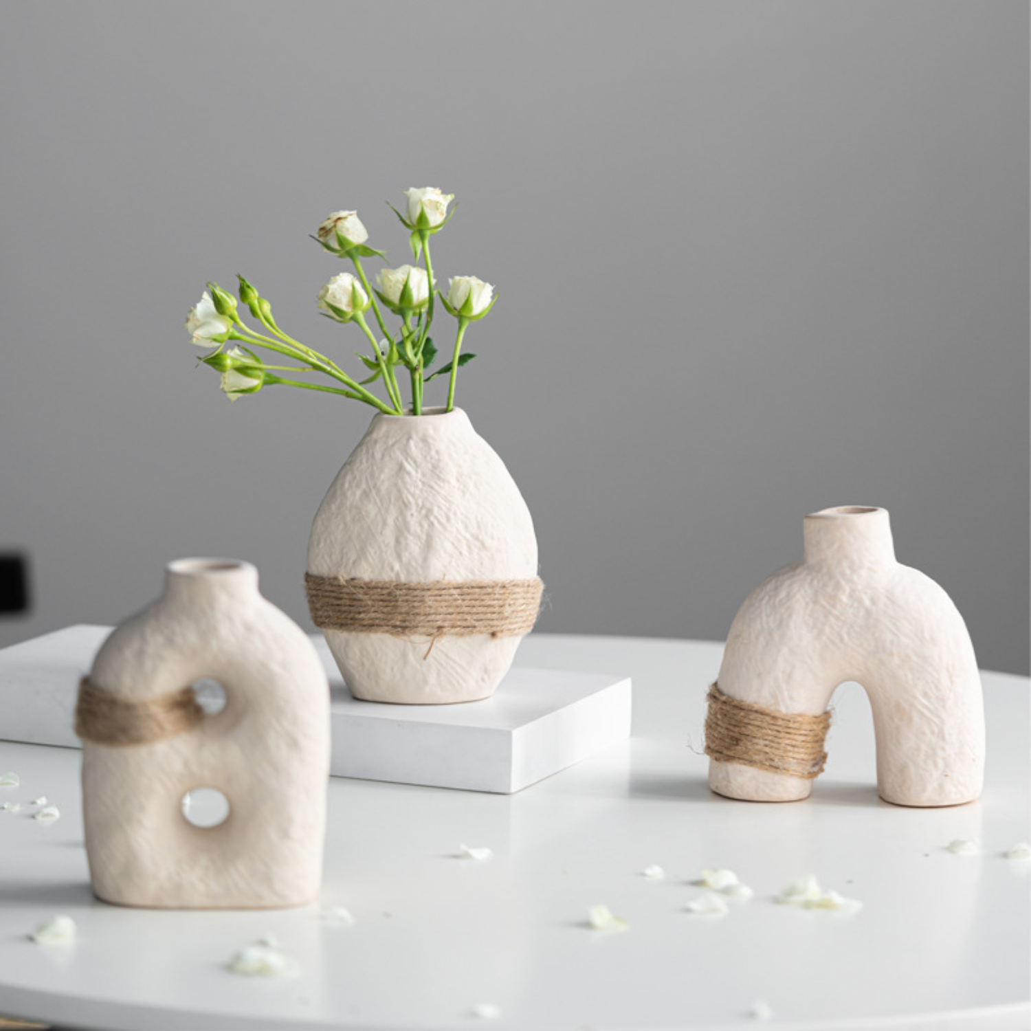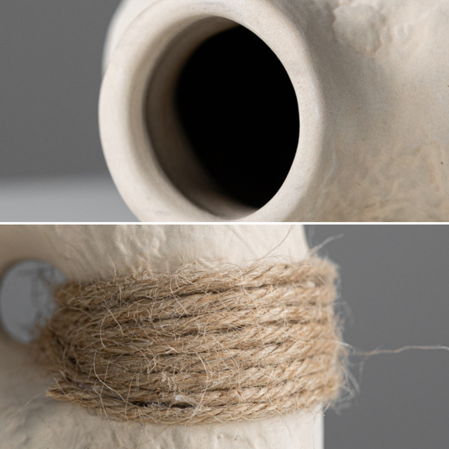 Haal de schoonheid van vakmanschap in huis met deze set van 3 keramische vazen, die organisch design, natuurlijke textuur en minimalistische elegantie combineren. Deze witte porseleinen vazen ​​hebben een gestructureerde afwerking en een natuurlijke henneptouwsluiting, wat een warme en authentieke touch geeft aan elke ruimte.